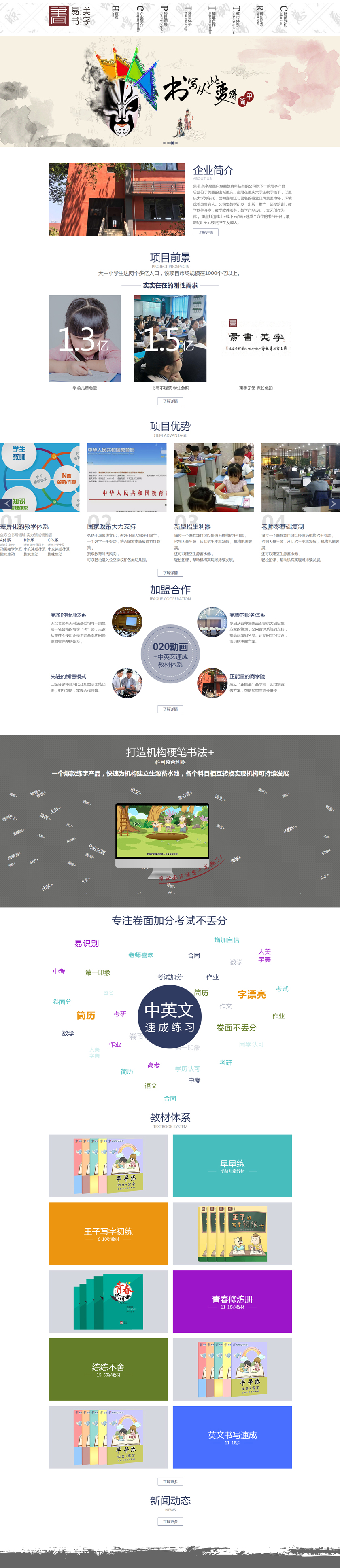 Project Description 易书.美字练字是重庆慧墨教育科技有限公司旗下一款写字产品,总部位于美丽的山城重庆,坐落 在重庆大学主教学楼下,以重庆大学为依托,面朝嘉陵江与著名的磁器口风景区为邻,环境优美 风景宜人。公司集教材研发,出版,推广,师资培训,教学软件开发,教学软件服务,教学产品 设计,文艺创作为一体,重点打造线上+线下+动画+速成全方位的书写平台,覆盖5岁至50岁的学 ... Official website address 江西# I want to share